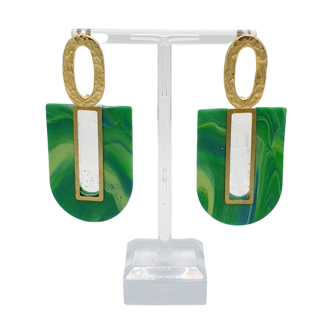 The stunning U-shaped clay pieces were made by hand-mixing green, teal, lime green and deep blue clay for a swirling marble effect. Rectangular raw brass charms have been embedded in the center of the clay using cured UV resin. This stunning pair hang from hammered raw brass oval earring posts. Nickel free.