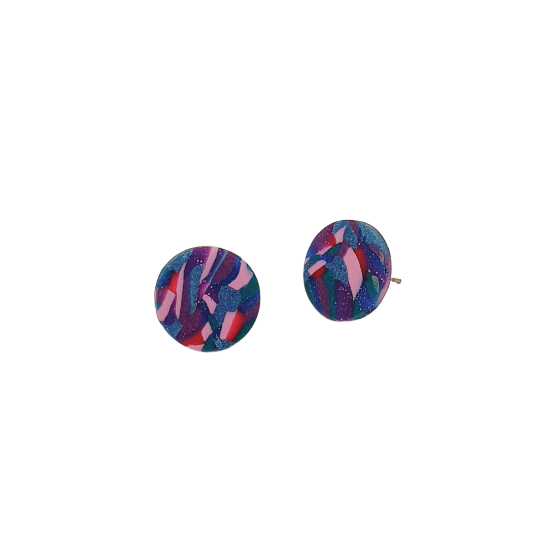 Pink, purple, and blue clay make these small circular studs. Stainless steel earring backs, nickel free.